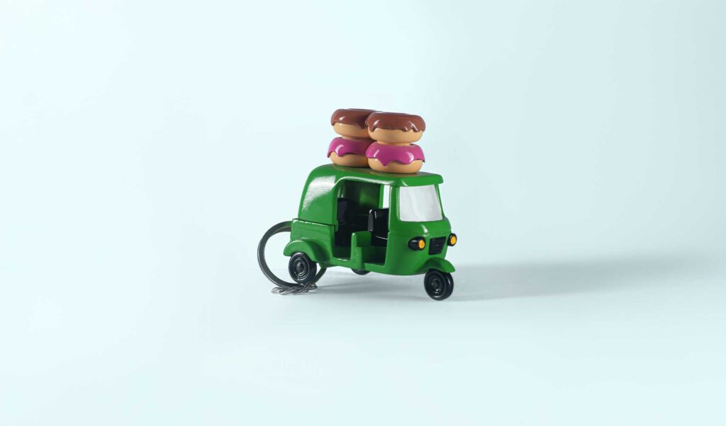 So, what did we do? We made a keychain that looks like an ice cream van with glazed doughnuts sitting on top. No massive logo. No brand name or logo stamped everywhere, just this quirky little thing that immediately makes sense when you see it.