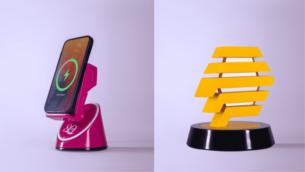 One way to guarantee brand recall from your corporate gifts is to create custom, daily-use items that carry your brand logo or a core element of your business. For instance, this multipurpose desk cradle that we designed for Wema Bank serves as a wireless charger and penholder while keeping the brand in view.